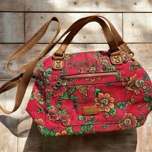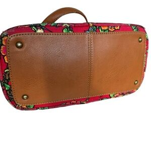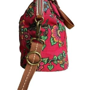 Sakroots retired Artist Circle True Love Boho canvas satchel with detachable crossbody shoulder strap (approx. 54”). Chunky hardware adds to the look of this beautifully colored bag. Zippered pockets on the front, back and inside. In Addition there are 2 more pockets inside. Enamel peace ornament above the traditional Sakroots ID tag. Manmade materials. Normal wear on bottom corners-see pics. Approx. 13x10x5