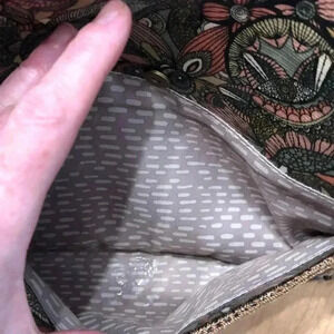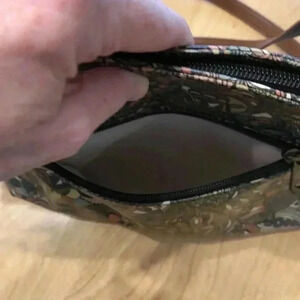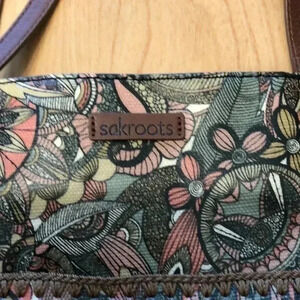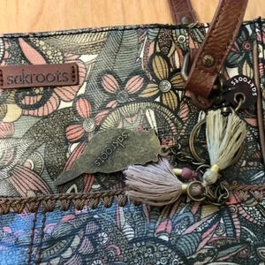 Sakroots small tote. Open compartment on front, zippered compartment on back, zippered close to main compartment which has one side zip pocket and two slip pockets. Green, peach, rose, blue, black, white floral design. In excellent condition. Measurements are 15-1/2” wide x 10” tall. Strap drop is 11”.