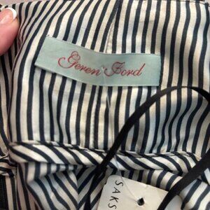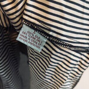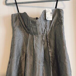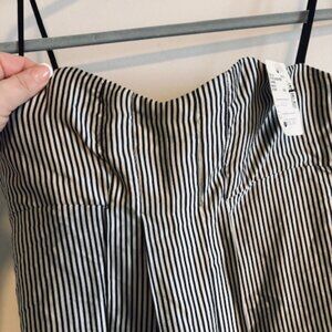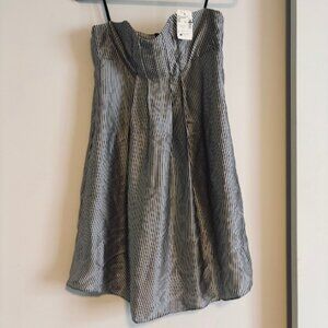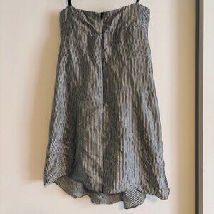 Beautiful strapless dress made from glossy high-quality silk in a vertical stripe pattern (ivory and gray-leaning navy blue) Empire waist, front pleating, pockets(!), sweetheart neck with light boning for structure. Unlined, but the silk is substantial enough that it doesn't require lining. So perfect for a spring date, party, or wedding!