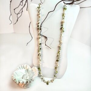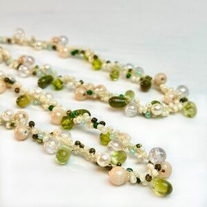 Saks 5th Ave Necklace🌿with Fresh Water Pearls & Semi Precious Stones / This is a gorgeous long necklace that can be doubled up, or worn single strand./ It's one of the more delicate weavings I've ever seen. / Hand woven, it's at once elegant, classic, and yet has a modern feel. / The necklace consists of Fresh Water Pearls, with a mixture of semi precious stones, including Tourmaline, Labradorite and Agate./ This is pure beautiful craftsmanship. / NWOT / Excellent Condition