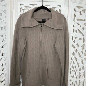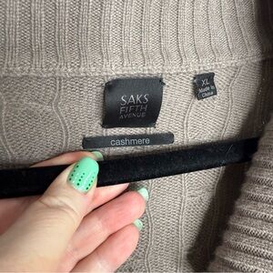 Saks 5th Avenue Taupe Cashmere Cabled Cardigan in excellent condition - gently worn with no flaws. 100% cashmere, super soft! Zip front, navy style collar, has front pockets. Light-medium weight and has a pretty cable knit. Would work on a Large or XL. Black label.