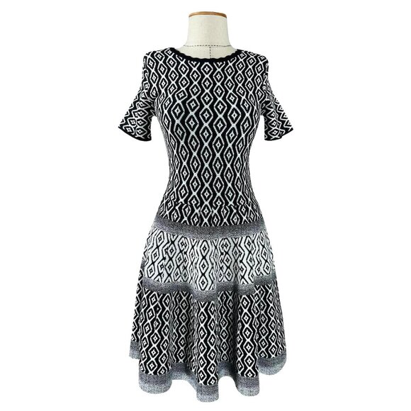 Timeless and chic, this Saks Fifth Avenue Black Label dress features a classic argyle print in black and white. Made from a soft stretch sweater knit, this pullover dress combines comfort and style. The skater fit-and-flare silhouette is flattering on all body types, while the short sleeves make it a versatile piece for year-round wear.