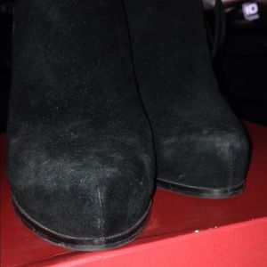 Saks 5/48 brand. Platform wedge-heeled suede booties with a back zip and side tie detail. They are 5 inches tall with a 1 inch platform and the top of the shaft hits just above the ankle. I have worn them on a handful of occasions, but they are too big for me. Very minimal wear, in like new condition.