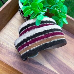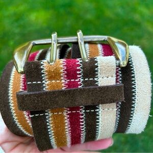 Saks Fifth Ave Wide Leather Belt. Stylish leather belt with multicolor stripes. Features shades of brown, cream, and red. Metal buckle with double prongs.