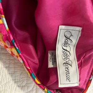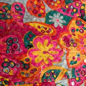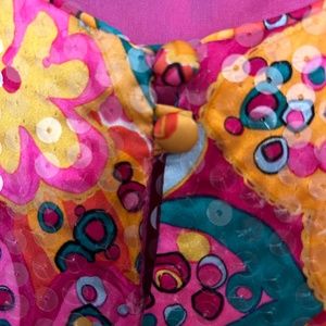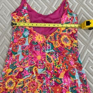A Line Dress with straps ,100% Silk. from Saks 5th Ave. covered in clear sequins to give it just a perfect amount of sparkle. Back is slightly lower than front of dress. Bright gorgeous colors , perfect for a spring or summer wedding or a night out. Both Flirty and Sophisticated. 16" wide at top and length is 35.5" long.. Size 6 Dress has a built in 100% Silk pink slip to match the rest of the dress. Only worn once.