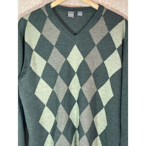 Saks Fifth Avenue 100% Extra Fine Merino Wool Mens Sweater Argyle Green M V neck