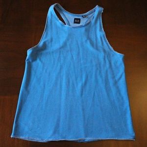 Saks Fifth Avenue BLUE Small Tank Top. Has look of a cutoff sweatshirt with rough edges, but not sweatshirt material. Very soft. Color is like azure blue tone. Wear is casually, to work out or over a bathing suit. Only worn a couple times. Very good used condition. Material tags were removed.
