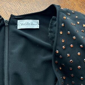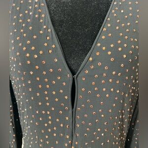 Beautiful and elegant dress featuring a chic black base adorned with stylish brown rhinestones polka dotted all over. Deep v-neck. Back zipper. Shoulder pads. Perfect for any classy occasion, it offers a sophisticated look with its classic design. Stretchy material for a form-fitting design. Excellent condition!