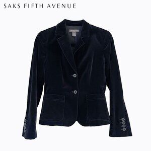 Elevate your wardrobe with this Saks Fifth Avenue classic fitted designer blazer for women. Crafted from luxurious black velvet with a hint of stretch, this chic blazer offers both comfort and a flattering fit. The structured, tailored silhouette is perfect for transitioning from the office to evening events. With its double-button closure, notch lapels, and button cuffs, this timeless piece exudes sophistication and dark elegance. Fully lined for comfort and finished with front pockets, this versatile blazer adds a touch of luxury to any outfit.