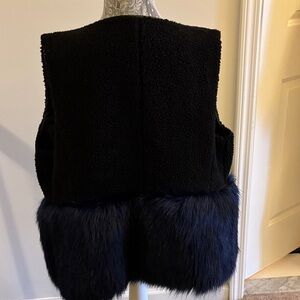 Stylish black vest with blue fur trim. Sleeveless design. Perfect for layering.
