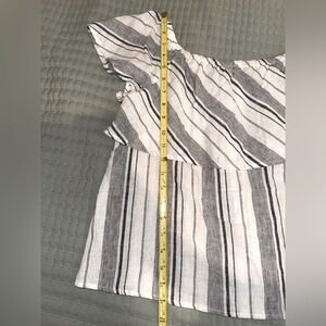 Saks 5th Avenue blouse is perfect for warm days and effortless style. Featuring a black, grey and white vertical stripe pattern, lightweight fabric, and a wide ruffle overlay, this top can be worn off-the-shoulder or on the shoulder for versatile looks.