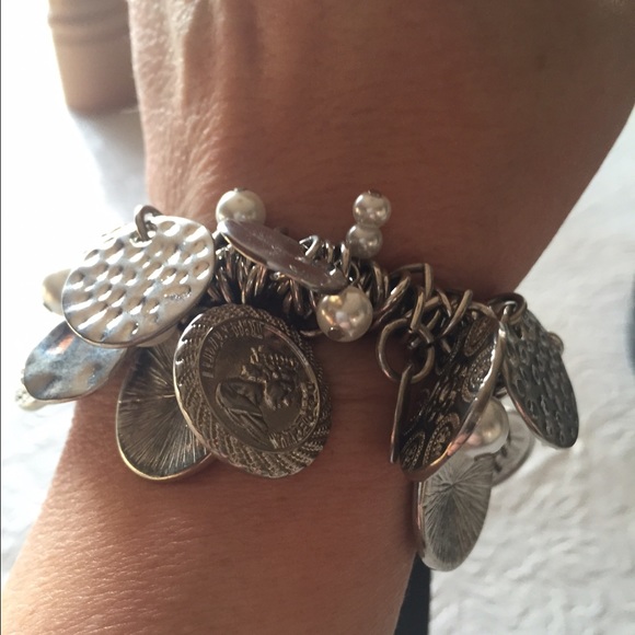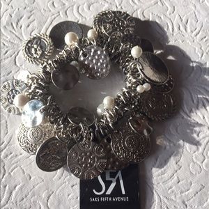 Saks Fifth Avenue bracelet. Silver Toned round coins and medallions. Embellished with faux pearls. Over 25 charms. No clasp- bracelet stretches. Received as a gift- has the Saks tag on it but no price tag so I couldn't return it. Fun bracelet but it's too small for my wrist.
