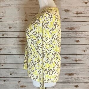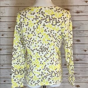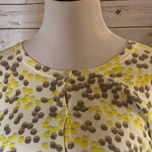 Cream w/ yellow, grey and tan circle pattern; scoop neck; long sleeves; 7-button front