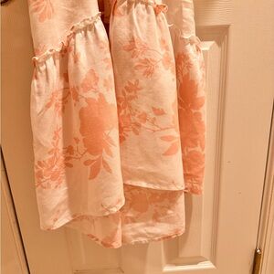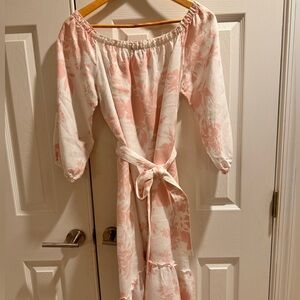 Shoulder-baring linen dress with a pink and white floral design enhanced by blouson sleeves and a high-low ruffled hem.