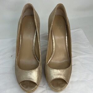Saks Fifth Avenue “Grace” Sz 9.5 Gold Suede High Heel Wedge Open Toe Shoes