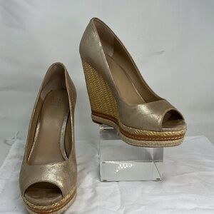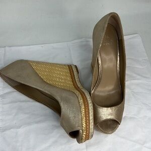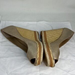 This is a Saks Fifth Avenue Sz 9.5 Gold Suede High Heel Wedge Open Toe Shoes. Suede metallic leather top with woven and espadrilles bottom and a non slip outer sole. Some scuffs. Minor under interior peeling. Padded inner sole. No odors.