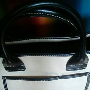Tan suede & black leather handbag. Black leather trim w/ tan stitching throughout . Double pocket @ front exterior, Large pocket has hidden Velcro closure. Interior black. Interior great condition. Exterior suede great condition, small gash in leather @ front trim (photo 7), comes w/ small zip closure removal pouch, otherwise great condition, 10"H, 14"L,5.5"W, 10"D. 6" shoulder drop, Made in China