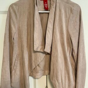 Elegant light tan jacket with open front design. Perfect for versatile styling.