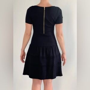 Fun, flirty, classic and comfortable, what more could you ask for? Pleated design on front and skirt. Back highlighted with gold zipper. Dropped waist. A-line skirt. Perfect amount of stretch.
