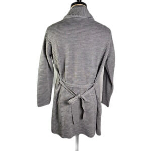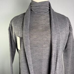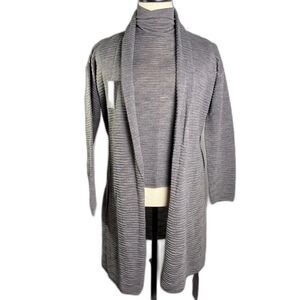 This lovely set features a gray short sleeved, turtleneck sweater and a matching long sleeve, long cardigan. The set still has the original tags attached and is in excellent condition! It may be vintage, but it will still be stylish today. Very soft and comfortable. The set is 50% merino wool and 50% acrylic. The set has a raised, striped texture to it, similar to crepe.