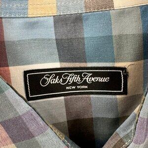 This lot includes two versatile Saks Fifth Avenue New York men's XL shirts. Featuring a breathable linen solid shirt and a plaid button-up, suitable for diverse settings.