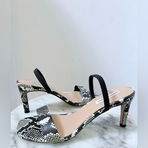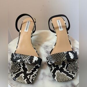 Stunning Saks Fifth Avenue high heels with an elegant black, white, and taupe snakeskin print. Features an open toe, sleek square front, black elastic ankle strap, and stiletto heel for a modern, sophisticated look. Only worn once—excellent condition with minimal signs of wear on the sole.