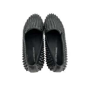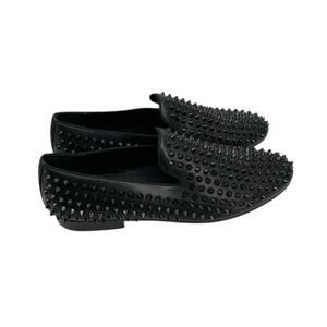 The product is a pair of men's Saks Fifth Avenue loafers in size 12, featuring studded spikes added for a stylish touch. The black leather shoes have a slip-on closure and a leather upper material, making them durable and comfortable for casual wear. With a classic loafer style and leather outsole, these shoes are versatile for all seasons and can accentuate any men's outfit with their trendy design.