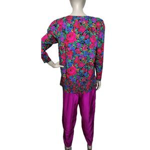 Gorgeous vintage 80's Richard Warren Saks Fifth Avenue 100% silk bold colorful floral blouse, side button-down, pleated puff balloon sleeve, shoulder pads (easily removed) give that high shoulder look that's currently on trend, smocked waist, shown tucked in for this look. Size is marked 6P fits like a modern M/L depending on your measurements and desired fit.