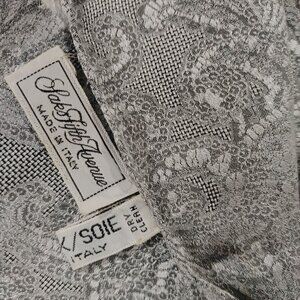 This vintage Saks Fifth Avenue silk scarf from Italy features an elegant paisley design. Its delicate fringed edges and timeless gray tones exude sophistication.