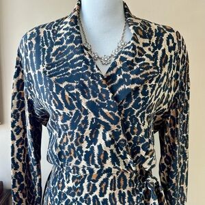 Saks Fifth Avenue Vintage Leopard Print Silk Long Sleeve Wrap Dress Mini Size 8