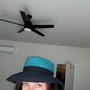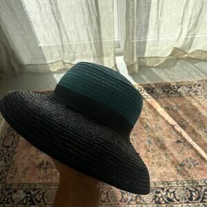 Saks Fifth Avenue Vintage Women's Sun Hat Wide Brim blue and Black 100% straw made in italy..tear in brim see photo doesn’t effect wear. reflected in price