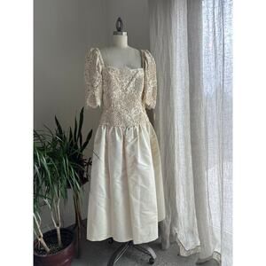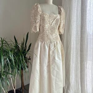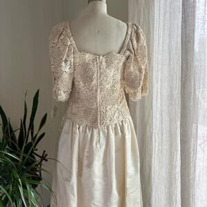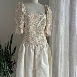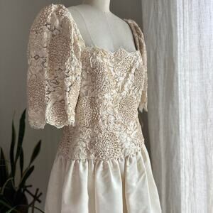Saks Fifth Avenue Women’s Medium Dress Ivory Short Sleeved Vintage Wedding Gown Rare Party Dress with Unique heavy passementerie scalloped edging on bodice and sleeve
