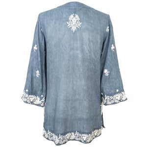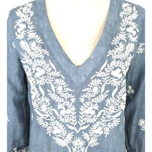 Saks Fifth Avenue 100% linen blue tunic top with gorgeous white floral embroidery
