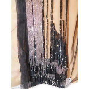 Rows of black bugle beads, black sequins, and gunmetal-colored metallic ribbon. Hook front closure.