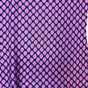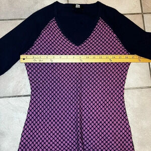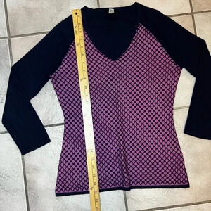 Saks Fifth Avenue lightweight sweater, size medium. Dark blue with a purple geometric pattern on the front. In excellent pre-loved condition. 55% Silk, 45% cashmere