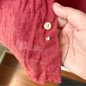 As shown in pictures, one of the extra buttons (not used to close the shirt) is broken, and there is some discoloration on one of the cuffs that I have not tried to launder out.