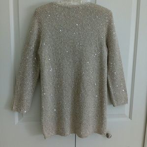 Holidays are here with a Saks Off 5th Sweater. A beautiful V neck soft sweater. Measurements are approximately 18" across the bust, 23" front length and 26" back length. Sleeves are 3/4 length at 20" and 15" across the back shoulder. The sequines really sparkle! You will get noticed wearing Saks Off 5th Sparkly Sweater!