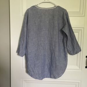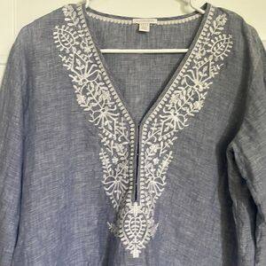 Beautiful preowned top with an embroidered v-neck, 3/4 sleeves and embroidered edges too! It’s in a blue chambray color, looks great over white pants!