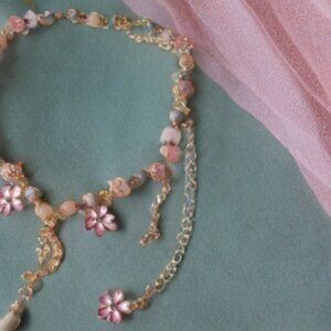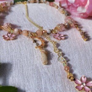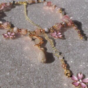 Experience the ethereal beauty of this handmade beaded choker featuring rose quartz, peach agate, and rhodonite beads, 18k gold crescent moon pendant with rhinestones and a white wrapped white jade pendant. Measures 15 1/2 inches. This gorgeous choker makes a perfect gift for special events that call for a touch of magic!