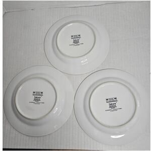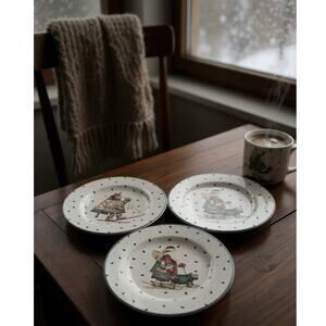Discontinued Collection of Sakura stoneware salad, lunch or dessert plates. Designed by Debbie Mumm. Set of 3, each has different character. Snowman, Bear, Scotty Dog on leash with lady. 8.25 inch diameter. Microwave and dishwasher safe.