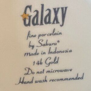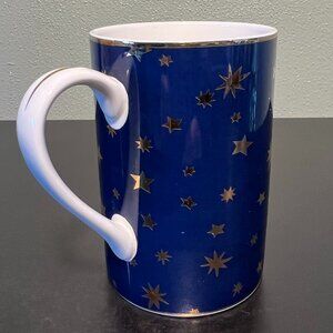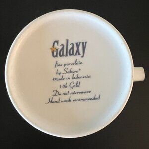 Out-of-this-world vintage fine porcelain cup / mug in the exquisite Galaxy Blue pattern by Sakura. Glossy cobalt blue background with 14k celestial star-studded pattern reminiscent of a starry night. Stunning 14k gold upper and lower borders complete the design. White handles with a 14k gold accent. Measures 4.25” tall with a 2.75” diameter; 4.25” across including handle. Holds 11 fluid oz. Discontinued pattern from the 1990s. Crafted in Indonesia..
