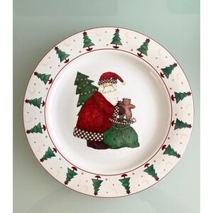 Large Sakura “Magic of Santa” Serving Plate. Gorgeous picture of a Santa with a bag, holding a teddy bear with a Christmas tree behind him. The plate is lined in red trim with miniature Christmas trees. It is approximately 12-1/2”.