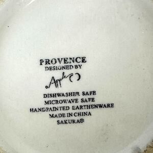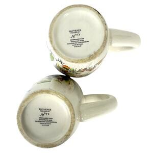 This set of two Sakura Provence Design by Apple Earthenware Coffee Mugs are Stunning! Each mug measures 4.5" H x 3.5" in diameter. These Hand Painted Heavy mugs depict a colorful French Village and are in very good condition-Note: Small chip on the handle of one of the mugs-see photos to verify/determine details and condition! Add these mugs to your dinnerware collection today! See other pieces of this dinnerware in our store to complete your set! # 3708