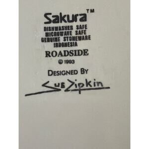 Set of three vintage Sakura “Roadside” dinner plates designed by Sue Zipkin (1993). Fun 1950s diner-inspired artwork featuring Route 66 signs, jukebox, burgers, and retro coffee cups. Genuine stoneware, dishwasher- and microwave-safe. Great for collectors, kitchen décor, or everyday retro dining.