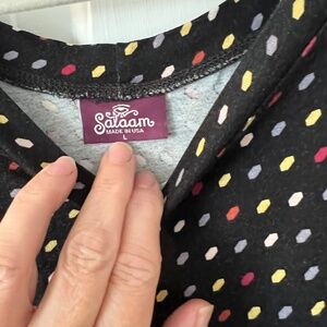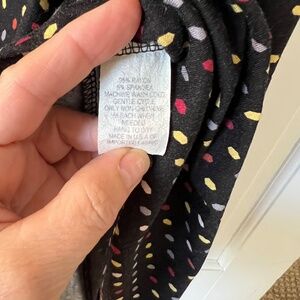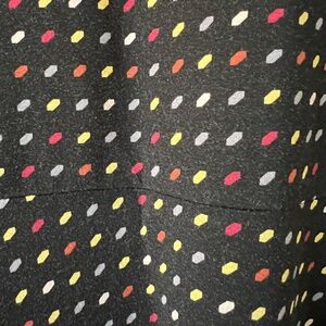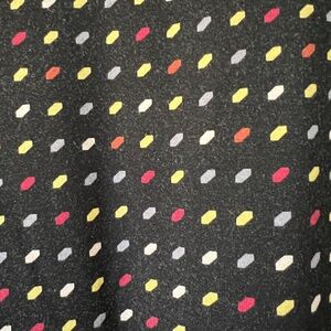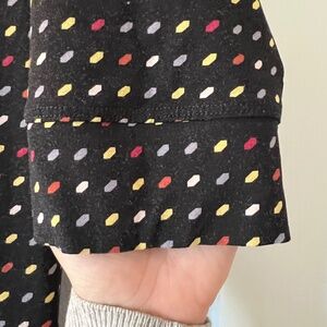 super flattering a line dress. dots are red, yellow, and grey on black. no stains. gently cared for. it is nice travel dress.