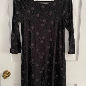 Black and white, circles and dots print. I believe this is Salaam’s “Lucy” style - similar to their “Lexi” but shorter. Would be great with leggings or over pants as tunic. If measurements (see below) suit you, even a short dress.