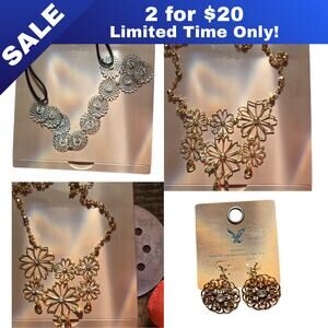 Jewelry Set, Bundle Deal, Flower Earrings, Floral Necklace, Metal Jewelry, Gold Tone, Silver, Statement Necklace, Boho Style, Modern, Classic, American Eagle, Kendra Scott, Mejuri, Gorjana, Pavoi, Gift, Everyday Accessory, Dressy, Casual Chic, Trendy, Festival, Party, Date Night, Spring Summer, Layering, Unique Design, Artistic, Bold, Feminine, Fashion Accessory, Lightweight, Hypoallergenic, Timeless, Minimalist, Elegant, Versatile