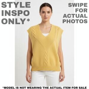 Yellow, Butter, Pastel, Sleeveless Sweater, Cable Knit, V Neck, Pullover Vest, Soft Cotton Yarn, Retro Style, Preppy, Casual Layer, Chunky Knit, Transitional Piece, Spring Fashion, Fall Outfit, School, Office, Minimalist, Cozy, Vintage Inspired, Relaxed Fit, Ribbed Hem, Zara, H&M, Urban Outfitters, Gap, Abercrombie, J.Crew, Ralph Lauren, Uniqlo, Vince, Naked Cashmere, Toast, La Ligne, Guest In Residence, Fear Of God Essentials, Eco Friendly, Sustainable Knitwear, Trending Layer, Youthful