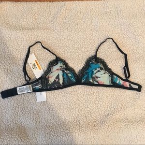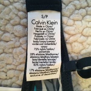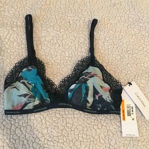 Pretty, delicate bra / bralette by Calvin Klein. Unlined and wireless. Dark blue with pattern. Size small. Nylon, Elastane. Brand new with tags!