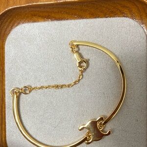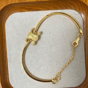 This exquisite Celine bracelet showcases a minimalist design in luxurious gold, perfect for adding a touch of elegance to any ensemble. Its smooth, curved lines and classic style make it a timeless accessory. Ideal for both everyday wear and special occasions, this bracelet embodies sophistication and simplicity.